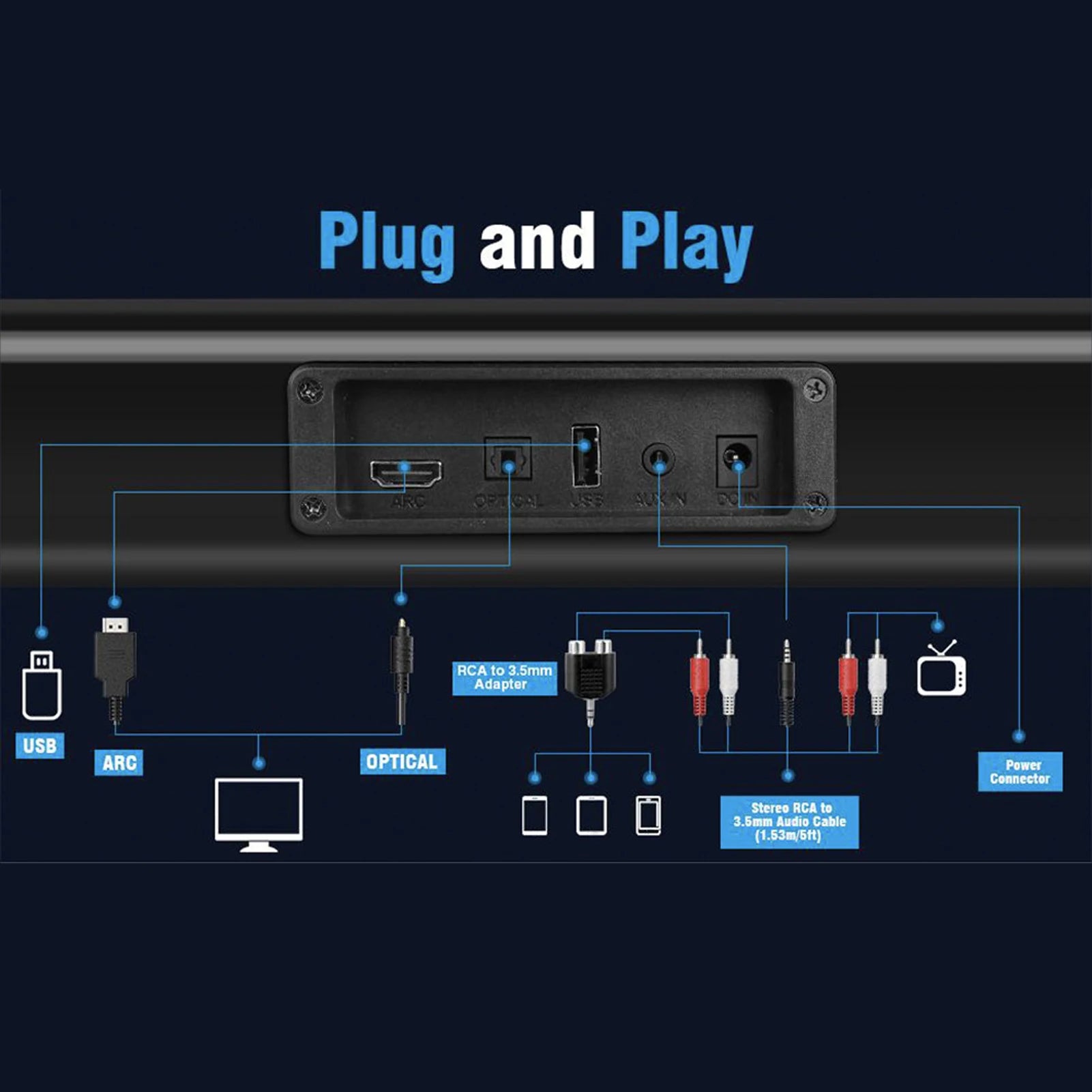 4. Wide Compatibility: HDs oundbar supports a wide range of devices with its various connection options, ensuring easy connectivity with your TV, smartphone, tablet, and more.