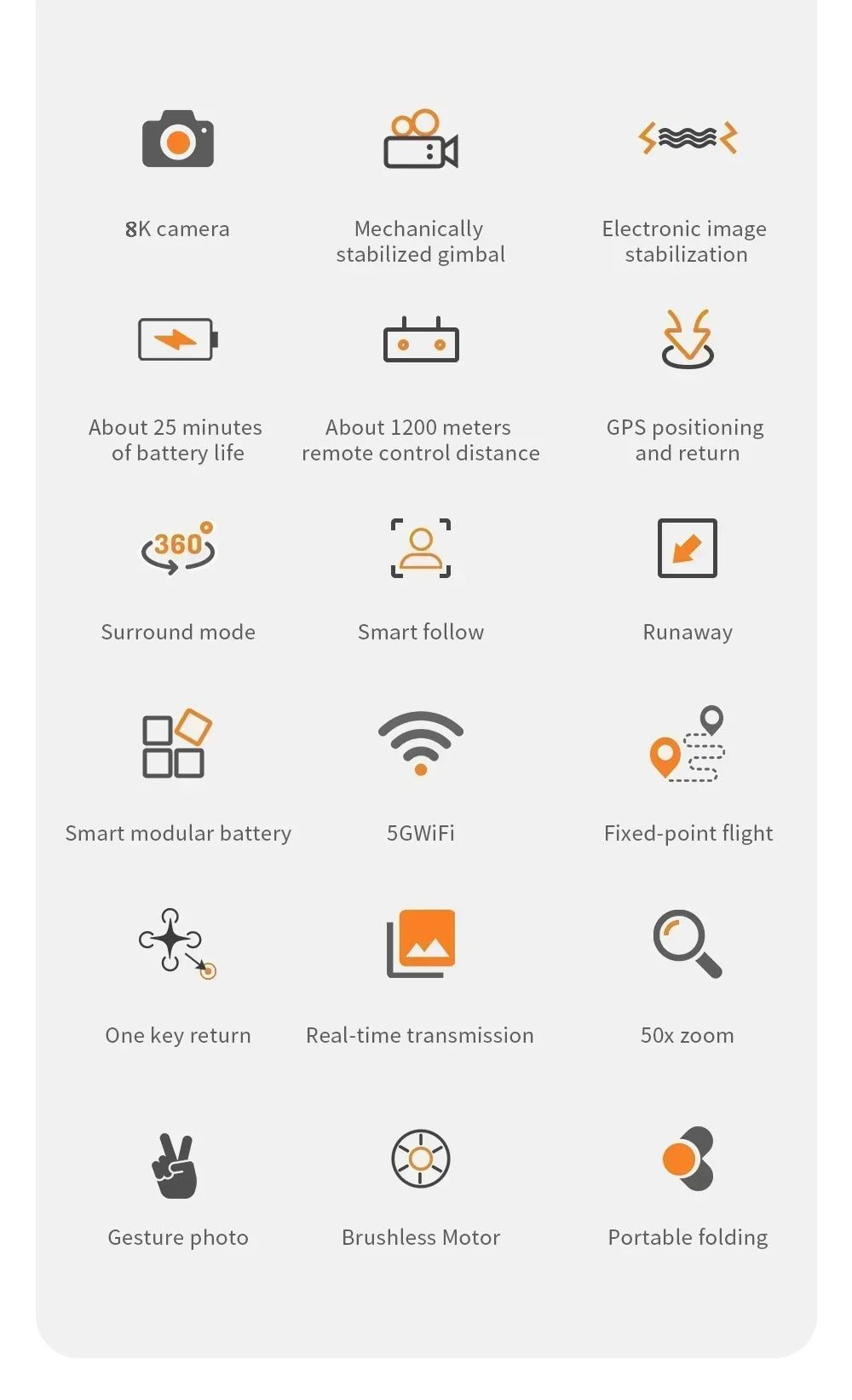 1.GPS mode and Optical flow mode dual mode. 2,GPS return to start point and point with low power and no signal. 3.GPS Smart following: After the plane left the GPS, it will open the APP following function, and the plane will follow the mobile phone. In addition, Image Following: Detect the shooting object and follow the flight automatically. 4.Gesture photography and recognition: Within 1-3m of the plane, make photographic gesture / photographic gesture in front of the camera. 5.Route multi-point planning flight: the plane autonomously fly after the pre-set route, the player focuses on shooting. 6.Fixed-point surround: Find the center of the surround, and then move the desired surround radius through the rocker. 7.Track and remind the drone: Click on the GPS signal icon three times, open the map interface, the map shows the closing distance of the aircraft, length and latitude position. 8. 8K HD camera 9.2-Axis Gimbal make photo more clear.