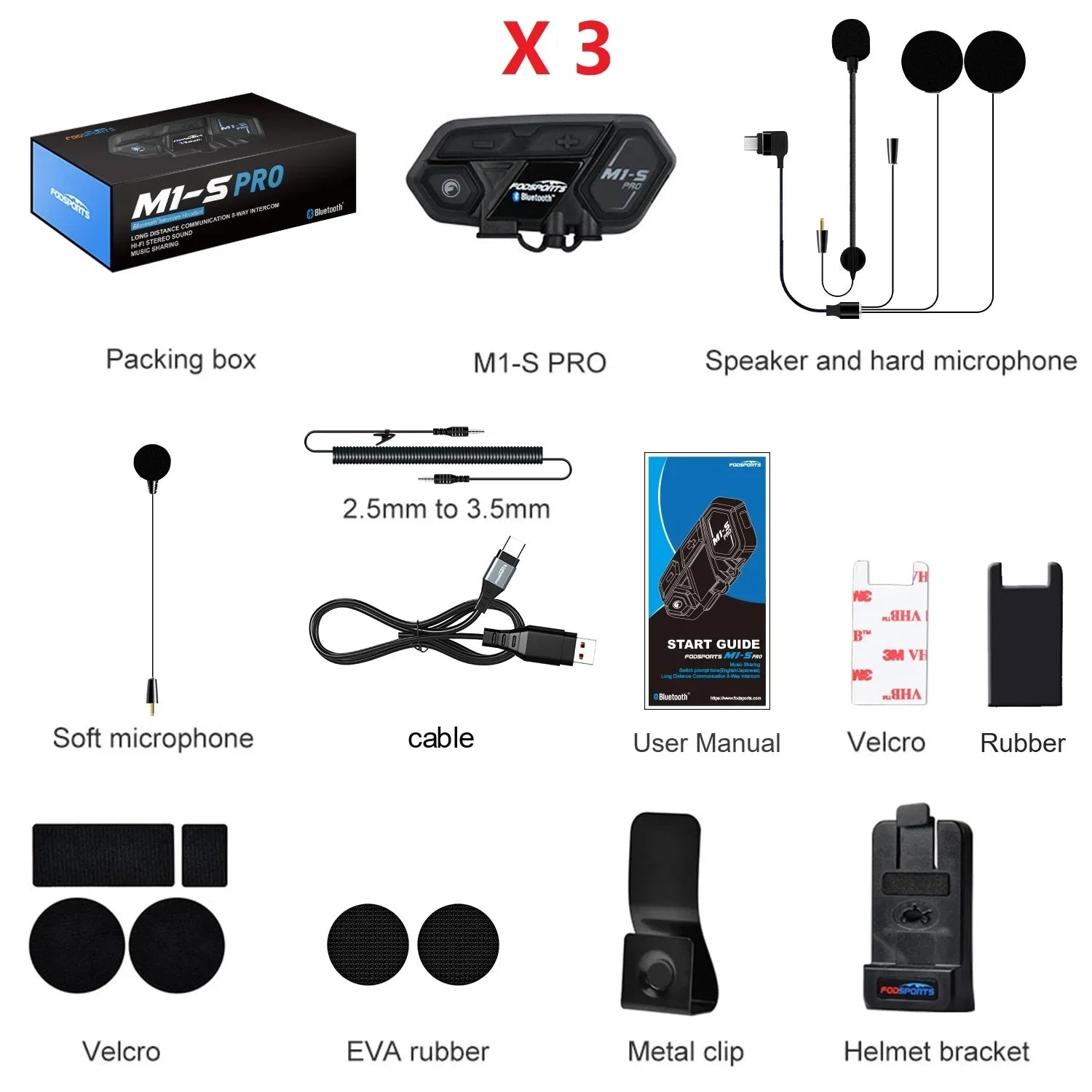 3pcs Fodsports M1-S Pro Helmet Intercom Headset Motorcycle Intercom Waterproof Bluetooth Helmet Headset 8 Riders 2000M