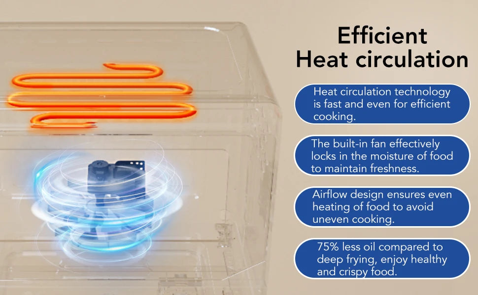 3. Efficient Air Frying Technology: With all-round fast heat circulation technology and powerful fan, it reduces 75% of fat and oil in your food while maintaining its crispy texture, allowing you to enjoy healthy and delicious food with less fat intake