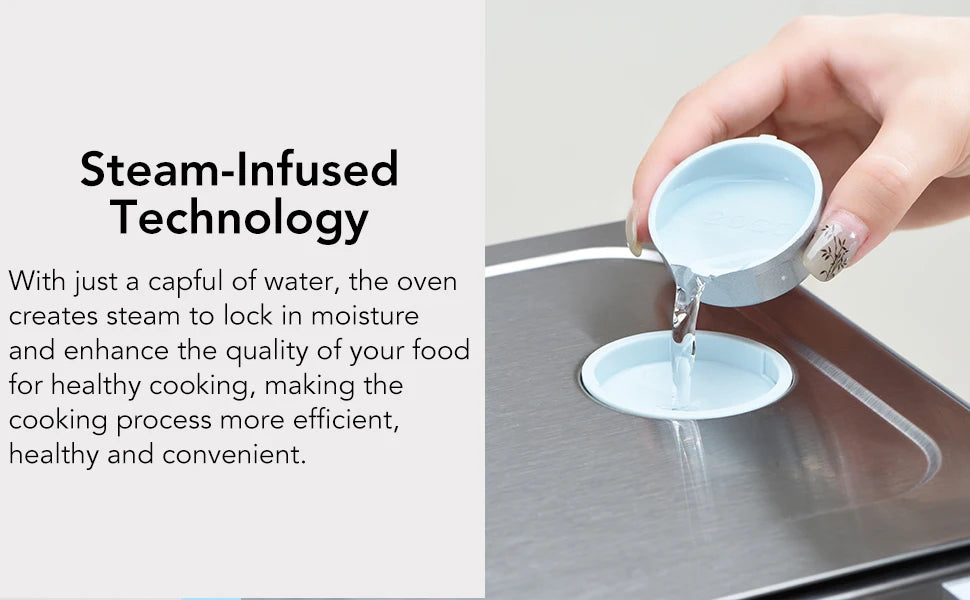6. Light Steam Injection Technology: The unique light steam injection function locks in the moisture of the food, enhancing the taste, aroma and texture of the food, bringing you a richer cooking experience