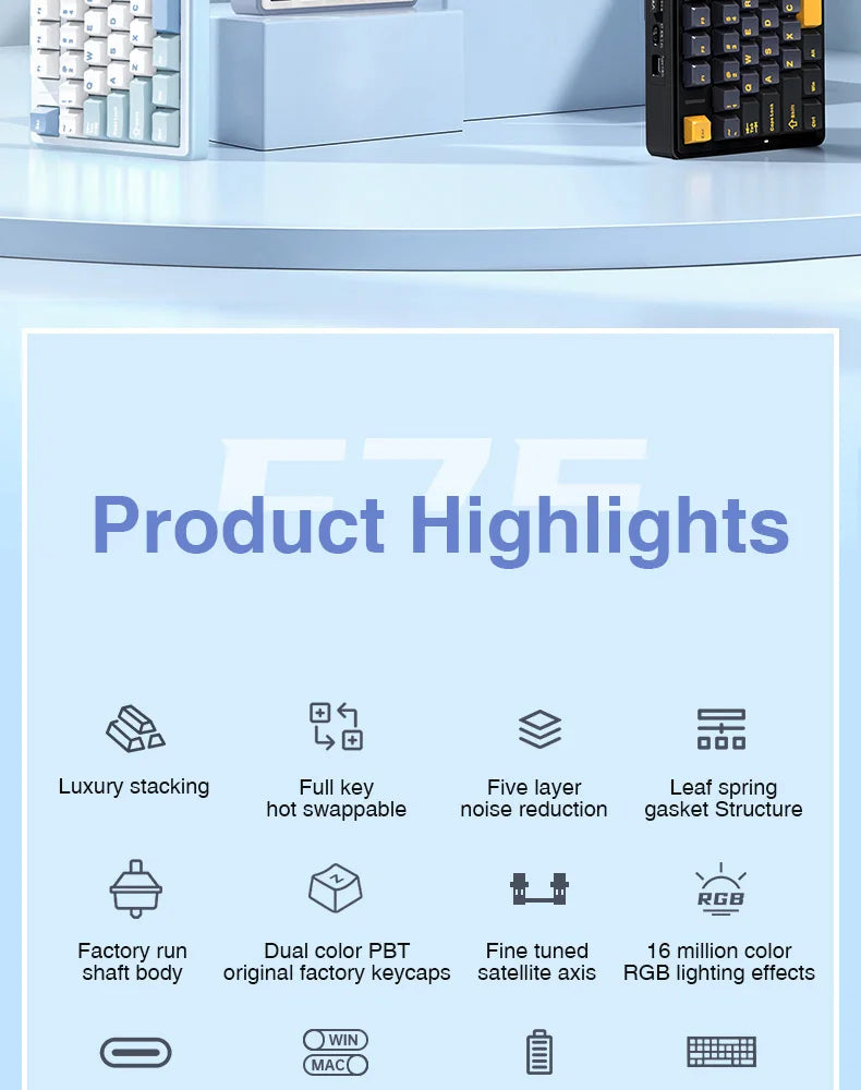 F75 is equipped with hot-swappable PCB to ensure free replacement or change of switches. It is compatible with most 3-pin and 5-pin mechanical switches. Pre-installed the pre-lubed custom switches providing unrivaled tactile responsiveness with up to 60 million keystroke lifespan.