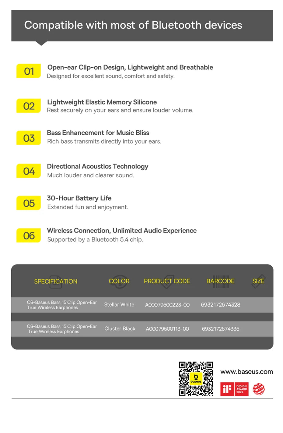 Baseus Bass 15 Clip Open-Ear TWS Earbuds