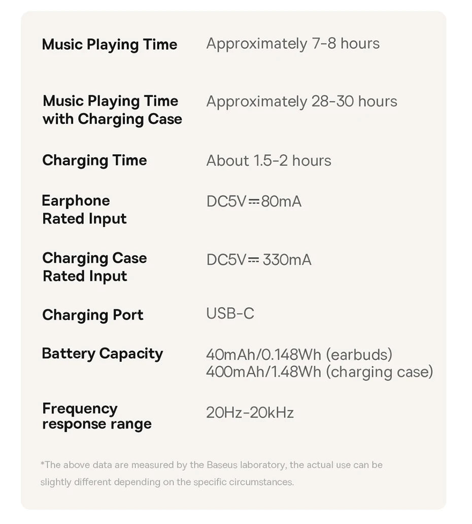 8、7hrs Playtime per charge/30hrs Playtime with charging case