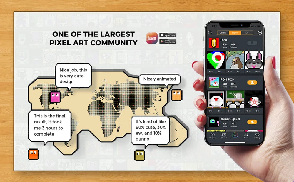 Pixel art creation on the Timebox-Evo is so easy and fun. You can take and convert a picture instantly into a pixel art design, or you can make pixel art animation as well. share your artworks in our community in the free app---Divoom. enjoy the funny pixel art world now!