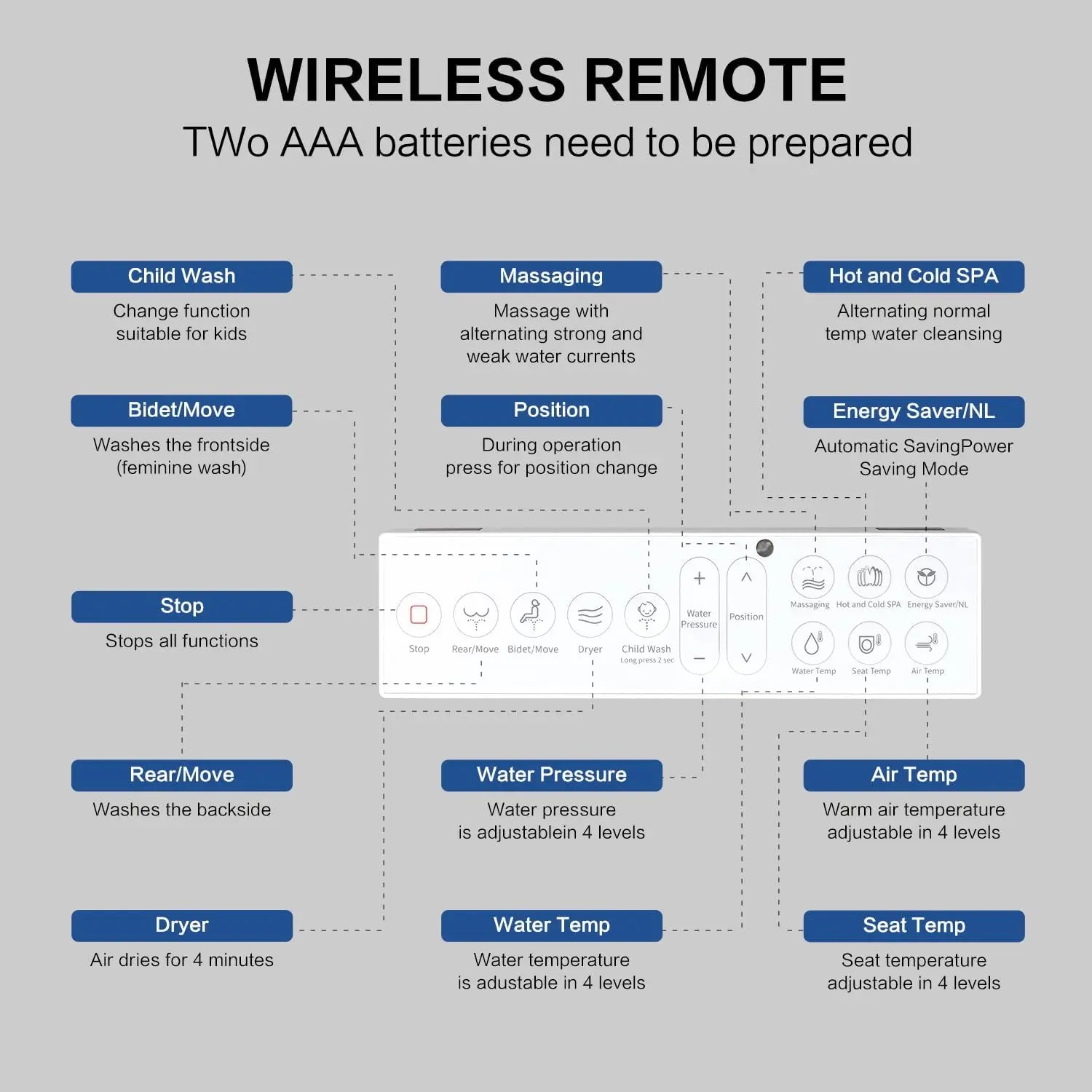 - Wireless Remote – lets you modify the water and seat temperature, as well as increase and reduce the water pressure settings, with easy one-touch operation of bidet functions
