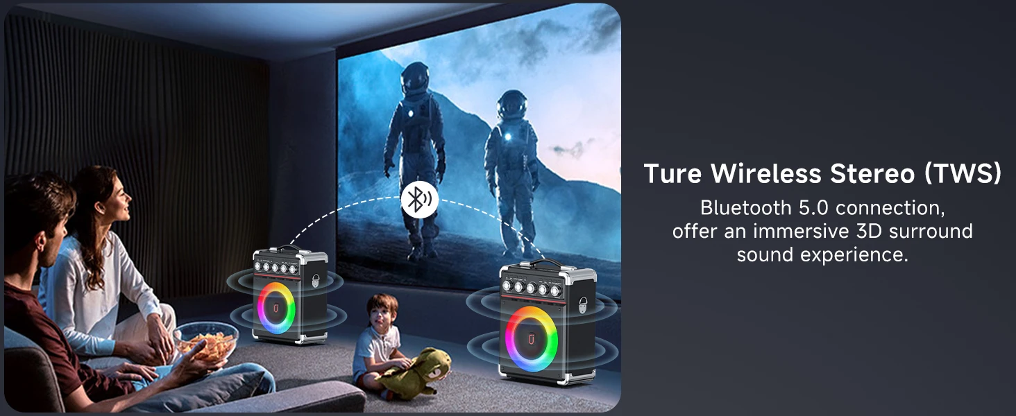 HD Stereo Surround Sound System】With advanced subwoofer and tweeter separation technology that ensures every note and beat is reproduced with precision, delivering crystal clear audio. Connect 2 identical partyboxes to turn on TWS mode. Get ready for a true auditory adventure that will take your party to the next level