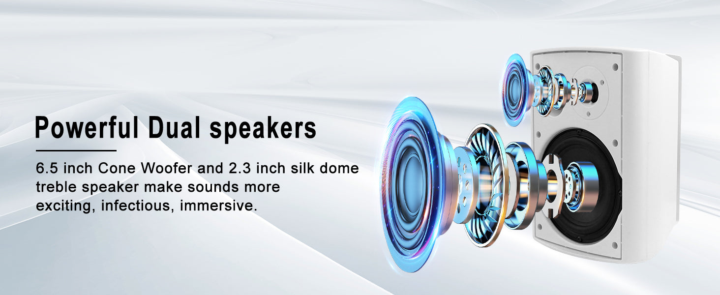 【High Power & Stable Without Distortion】This set of outdoor bluetooth speakers system has a maximum power output of 800 watt peak power (200W per speaker, 200W*4). The outdoor speaker includes a 6.5'' Powerful woofer & 2.3'' premium dome tweeter to ensure your area with clean highs, while feeling the deep bass response from the articulated sound enclosure