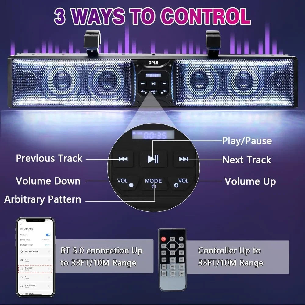 👍【Multiple Connection Ways】: utv sound bar with BT 5.0, you could connect it by your smartphone, MP3 Player, or any other compatible device, utv sound bar also features USB in/out ports 3.5mm AUX IN to offer more choice. The bluetooth name is “SOUNDBAR”, controlled range up to 33ft(10M), soundbar also could be controlled by remote controller and button control, remote control for convenient operation of volume, track selection, and other audio settings without needing to reach the sound bar directly,providing convenience and versatility.