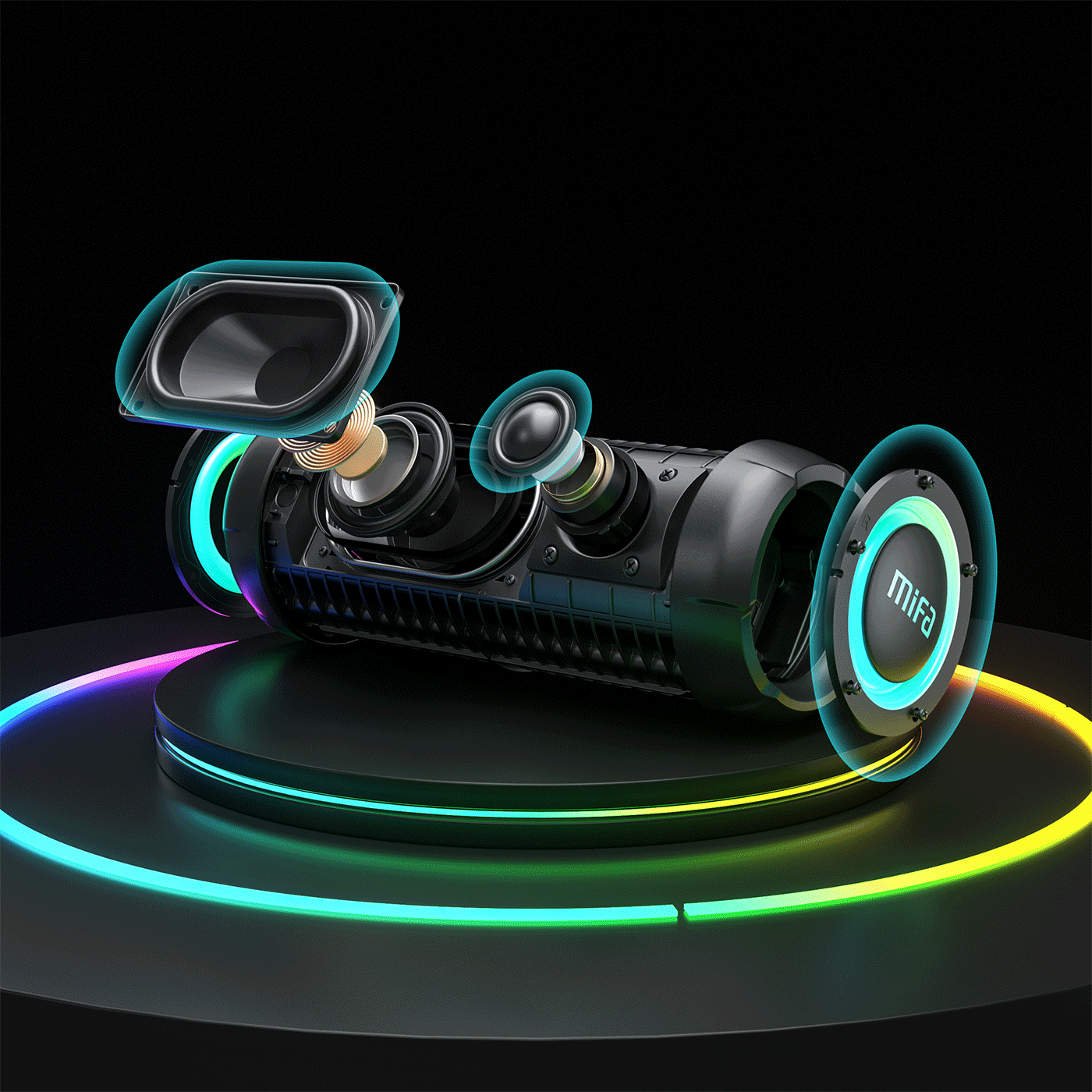 Mifa WildRod 2-way speaker system, engineered to deliver loud, crystal clear, powerful sound. Its racetrack-shaped woofer delivers exceptional low frequencies and midrange, while a separate tweeter produces crisp, clear high-frequencies. WildRod also features optimized dual passive radiators for deep bass