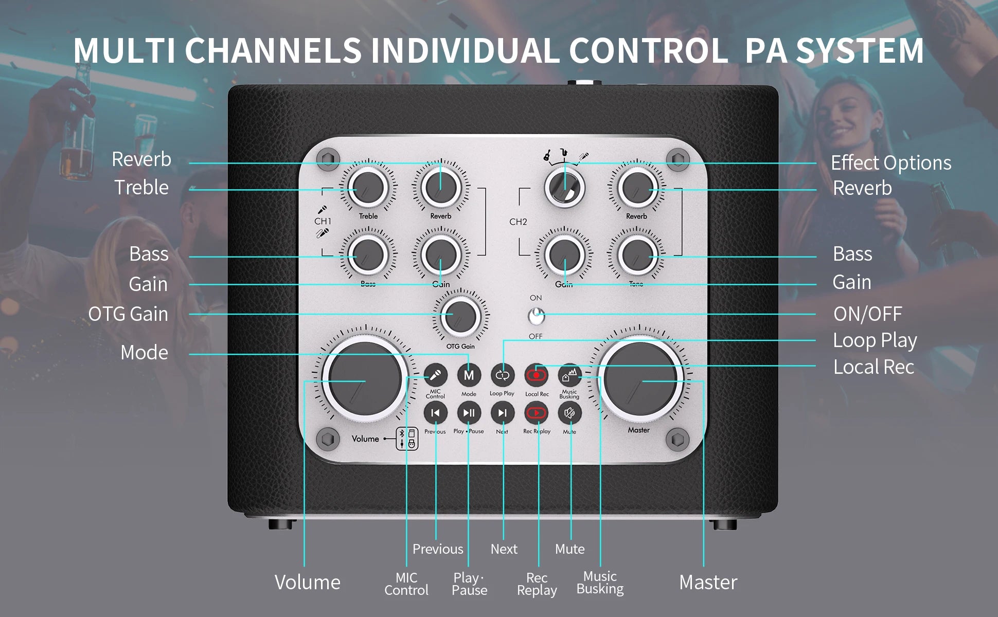 Professional bluetooth karaoke machine with versatile connectivity - The MLOVE portable karaoke machine is perfect for music lovers and performers. Comes with two UHF wireless microphones, 6.35mm jack for wired microphone & instrument inputs, such as guitars, keyboards, drums, and more. The 2-channel professional PA system lets you independently control sound effects like treble, bass, reverb, gain, and tone for both microphones and instruments. The 3-position knob on Channel 2 allows precise tuning for wired microphones, acoustic guitars, and electronic instruments, ensuring studio-quality sound for every performance