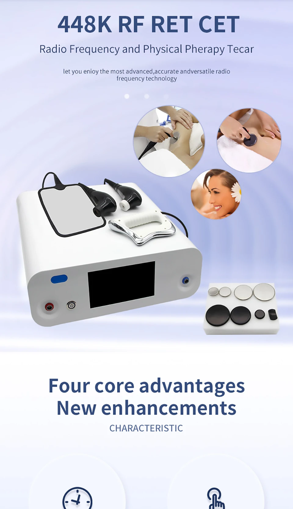 448KHZ is a more appropriate frequency for regulating the activity of ions inside and outside the cell. lt can effectively help the ions to move across the membrane throughthe cell membrane channel, so that the positive and negative ion exchange of the celis restored to normal, thereby balancing the positive and negative charge of the celland enhancing the activity of the cell Help cells repair their natural functions. Thistechnology has been clinically verified and acts on the body from the inside out to satisfv vour effective aesthetic effect in an effective and painless way. Provide beauty caresolutions for a wide range of beauty applications.