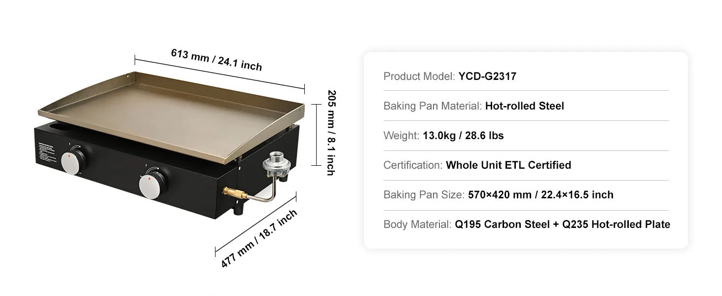 User-friendly Design: The drip holes direct excess oil, water, and residue towards the oil cup. The side oil storage compartment prevents grease from spilling. The removable grill plate makes cleaning easier. The compact and portable commercial gas grill design allows you to carry the grill anywhere, creating a mobile kitchen.