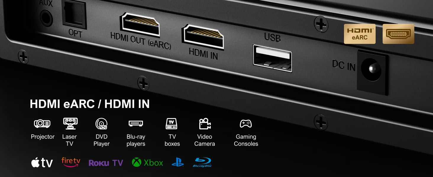 Connectivity Technology: HDMI IN/eARC, Auxiliary, Bluetooth 5.3, Optical