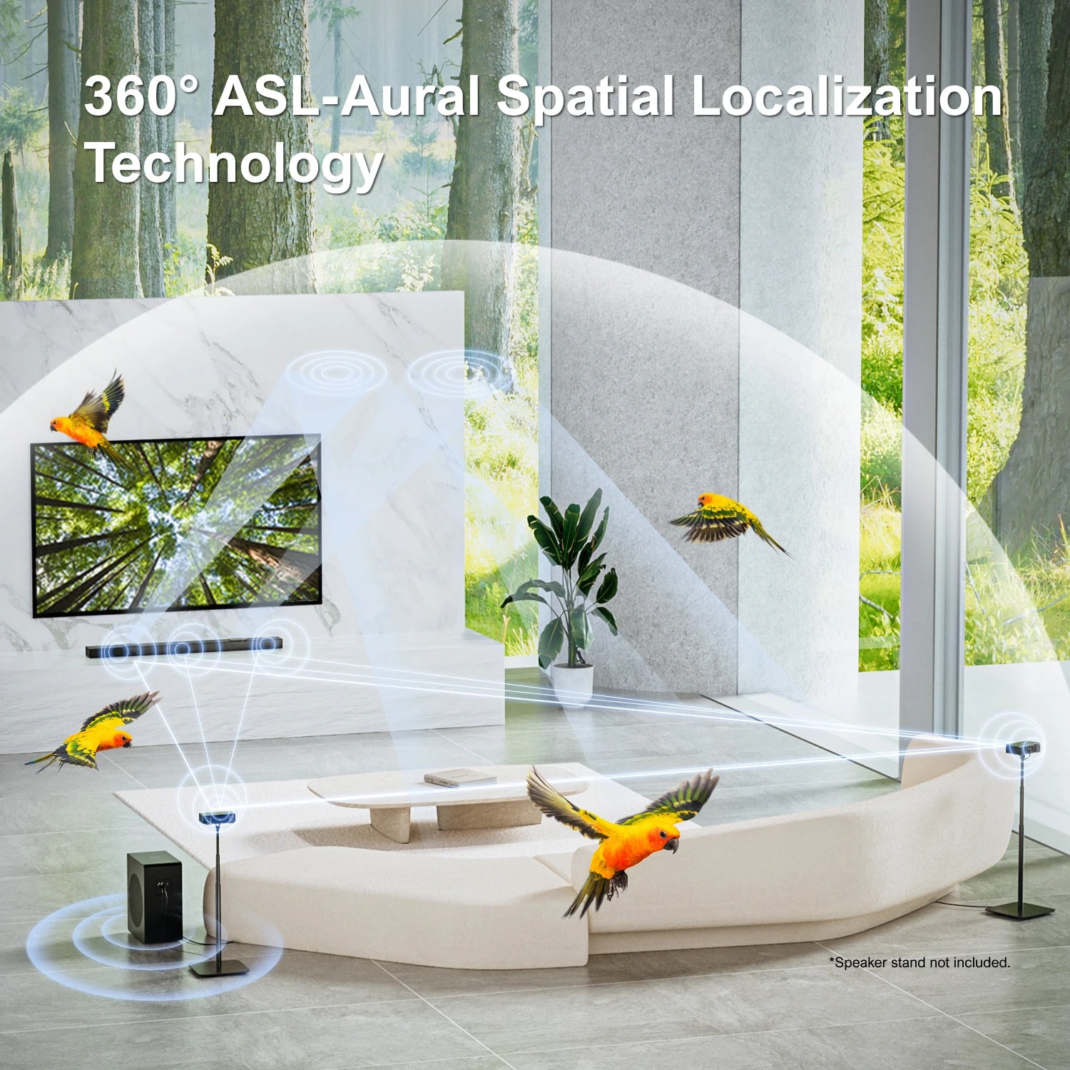 2 Up-firing drivers, direct sound upward and reflect off the ceiling to produce incredibly lifelike, overhead sound, along with 2 rear surround speakers, seamlessly orchestrate 360° sound, elevate your audio journey with precision in all dimensions.