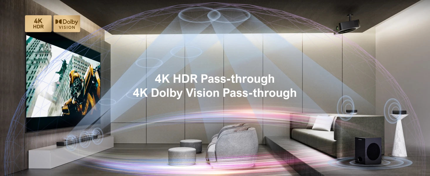 4K HDR compatibility provides a remarkable color palette, sharper contrasts, and incredible brightness. The seamless integration of 4K HDR and Dolby Atmos achieves a truly cinematic audiovisual feast, brings the highest standard of home cinema reproduction available on the market today.