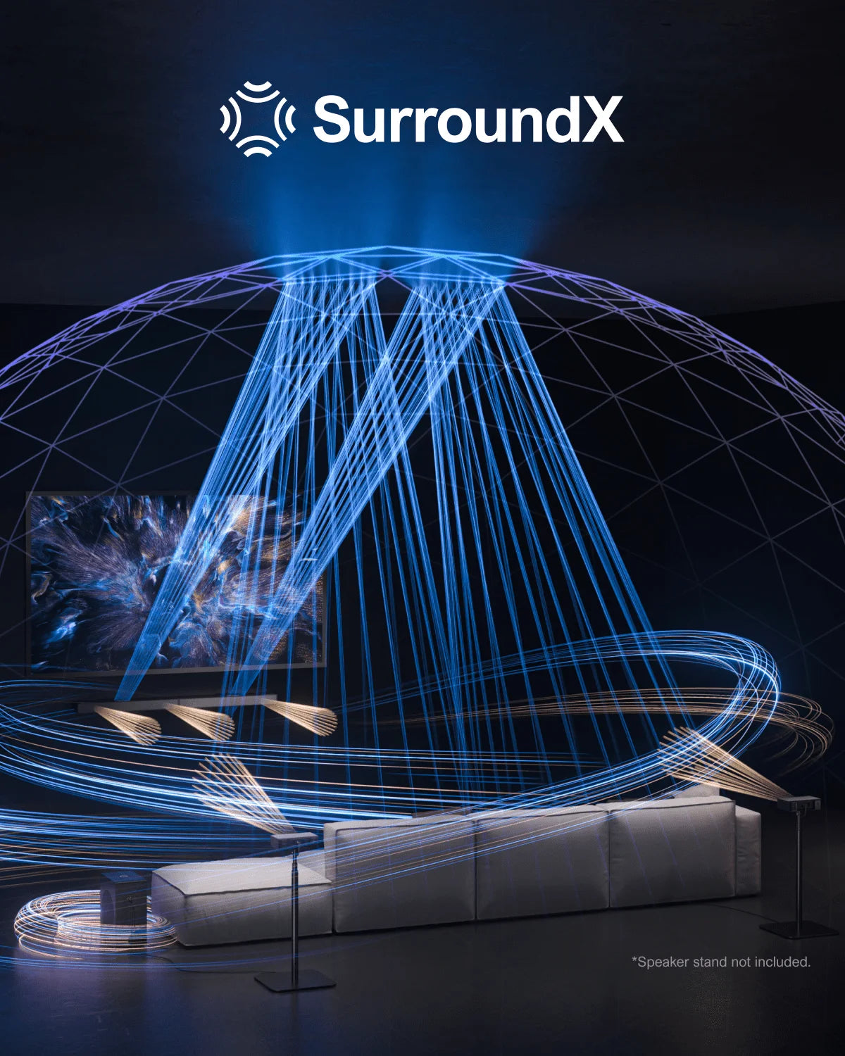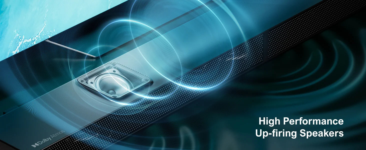 5.1.2 channels soundbar envelop your space, elevate your audio experience with precision in all dimensions (Dolby Atmos 5.1.2 certified). With 2 up-firing drivers and 2 rear surround speakers. Dolby Atmos delivers a more realistic and encompassing surround sound that transports you to the very heart of your entertainment.