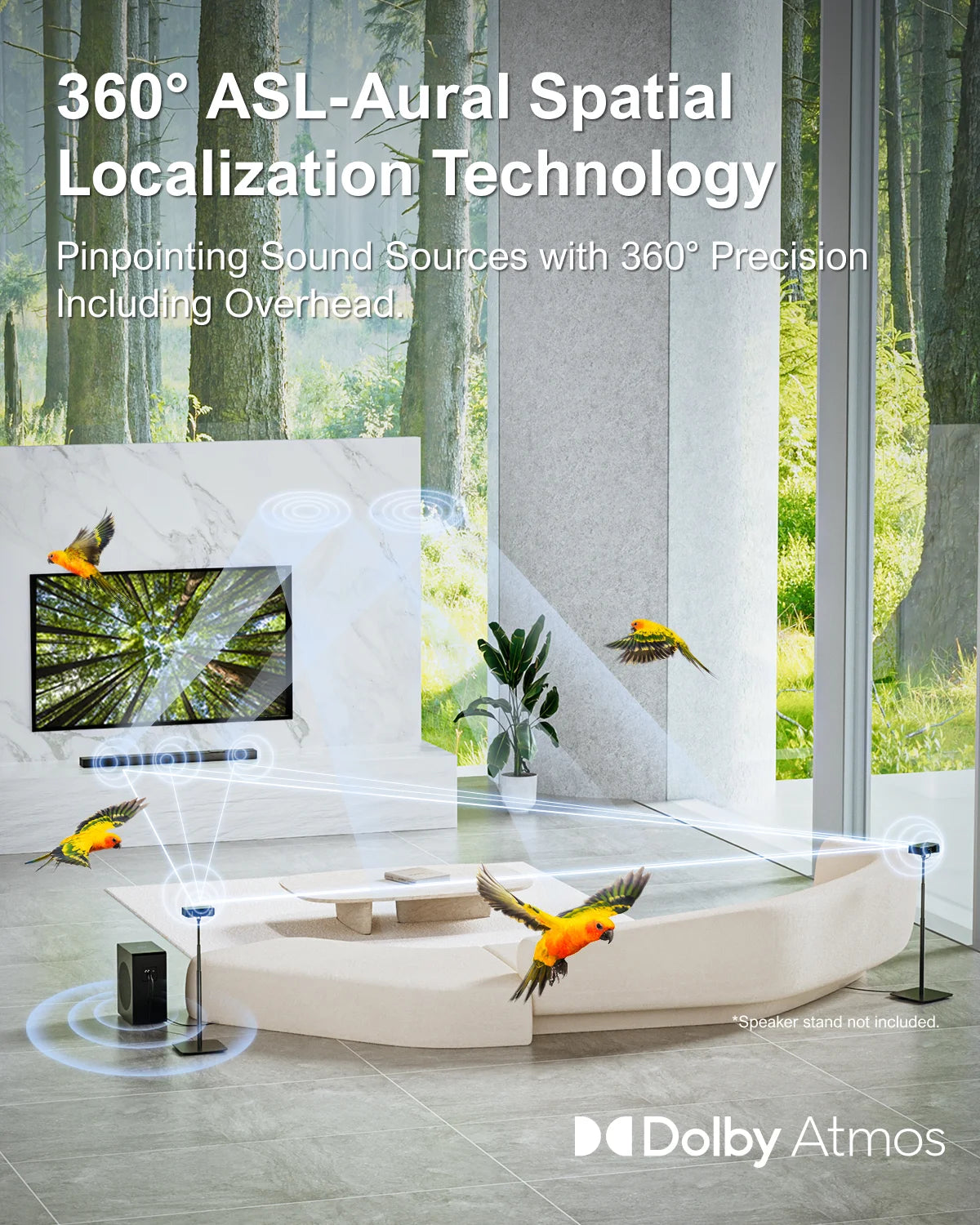 2 Up-firing drivers, direct sound upward and reflect off the ceiling to produce incredibly lifelike, overhead sound, along with 2 rear surround speakers, seamlessly orchestrate 360° sound, elevate your audio journey with precision in all dimensions.