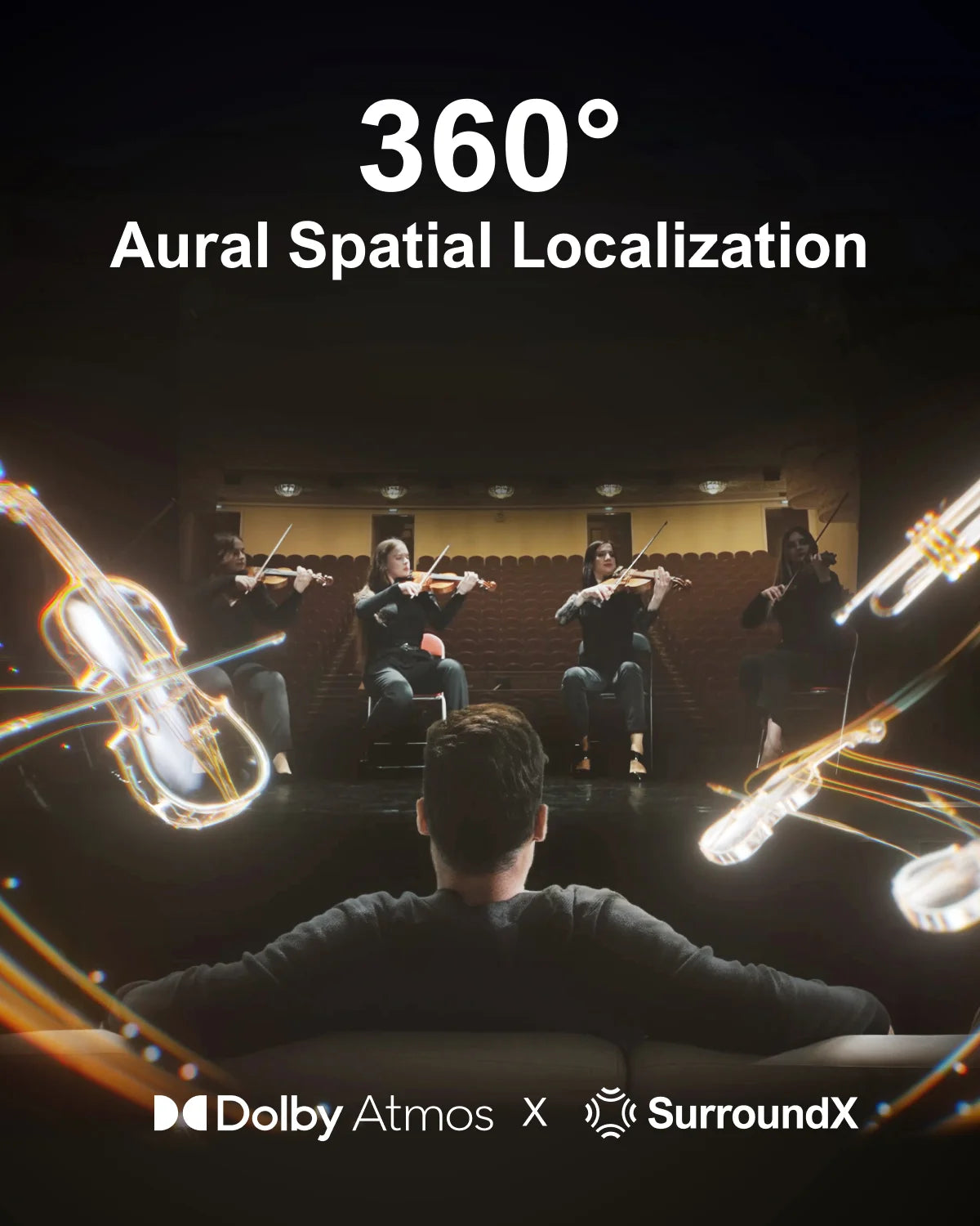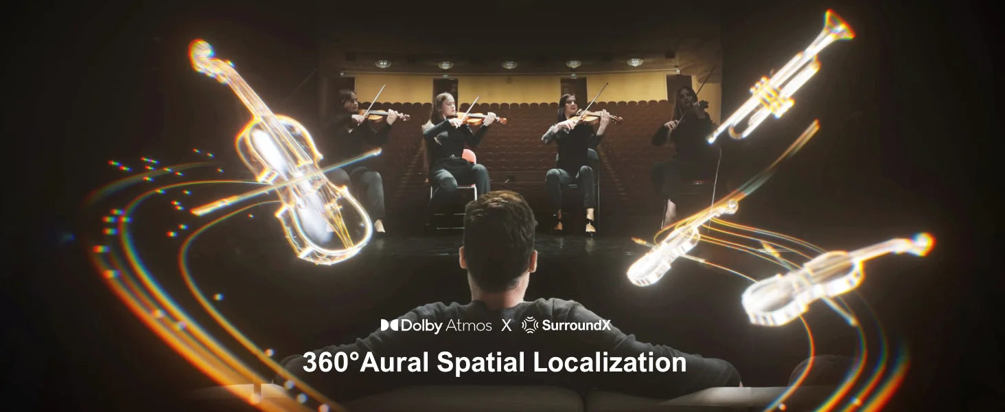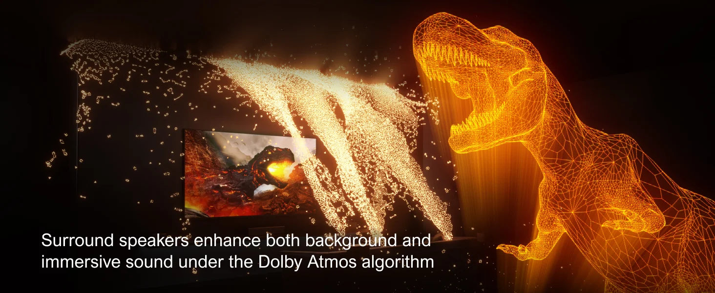 The smart tv soundbar is equipped with 2 rear speakers and 2 front speakers, ensuring precise sound projection to the front, back and sides, improving spatiality and sound immersion. Advanced SurroundX system and 360° auditory spatial location technology algorithms accurately position elements throughout the room. Custom waveguides project sound from wall to wall, so you feel like you're at the center of the story.