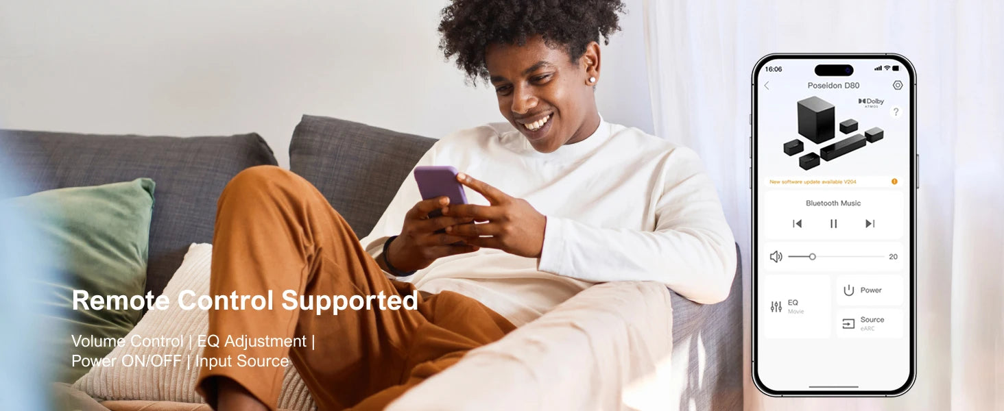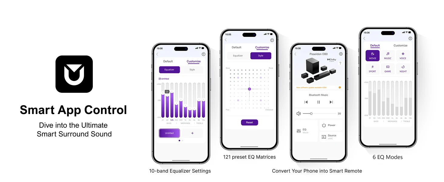 With the ULTIMEA Smart App, elevate your listening experience by customizing your audio system to match your style. The app not only caters for all your audio needs, but also keeps your soundbar up to date with regular OTA updates. This means your Poseidon D80 is always equipped with the latest features for a superior audio experience.
