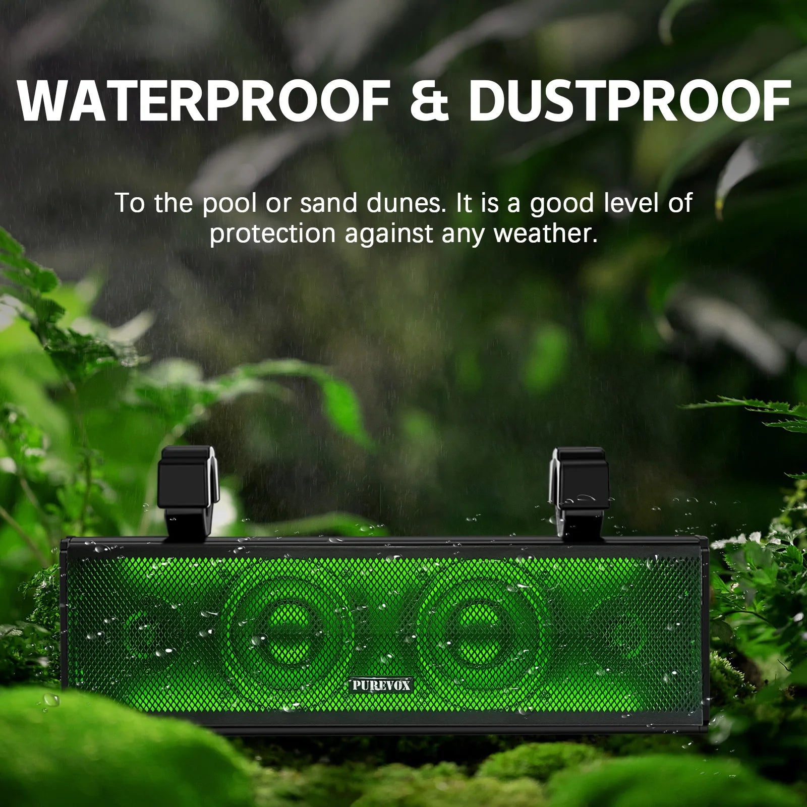 【IP65 Waterproof】PUREVOX SxS sound bar is compliant with IP65 Rating International Standard. Offering complete protection from dust, oil, and other non-corrosive material, and a good level of protection against water, allowing you to enjoy music in any environment and weather.