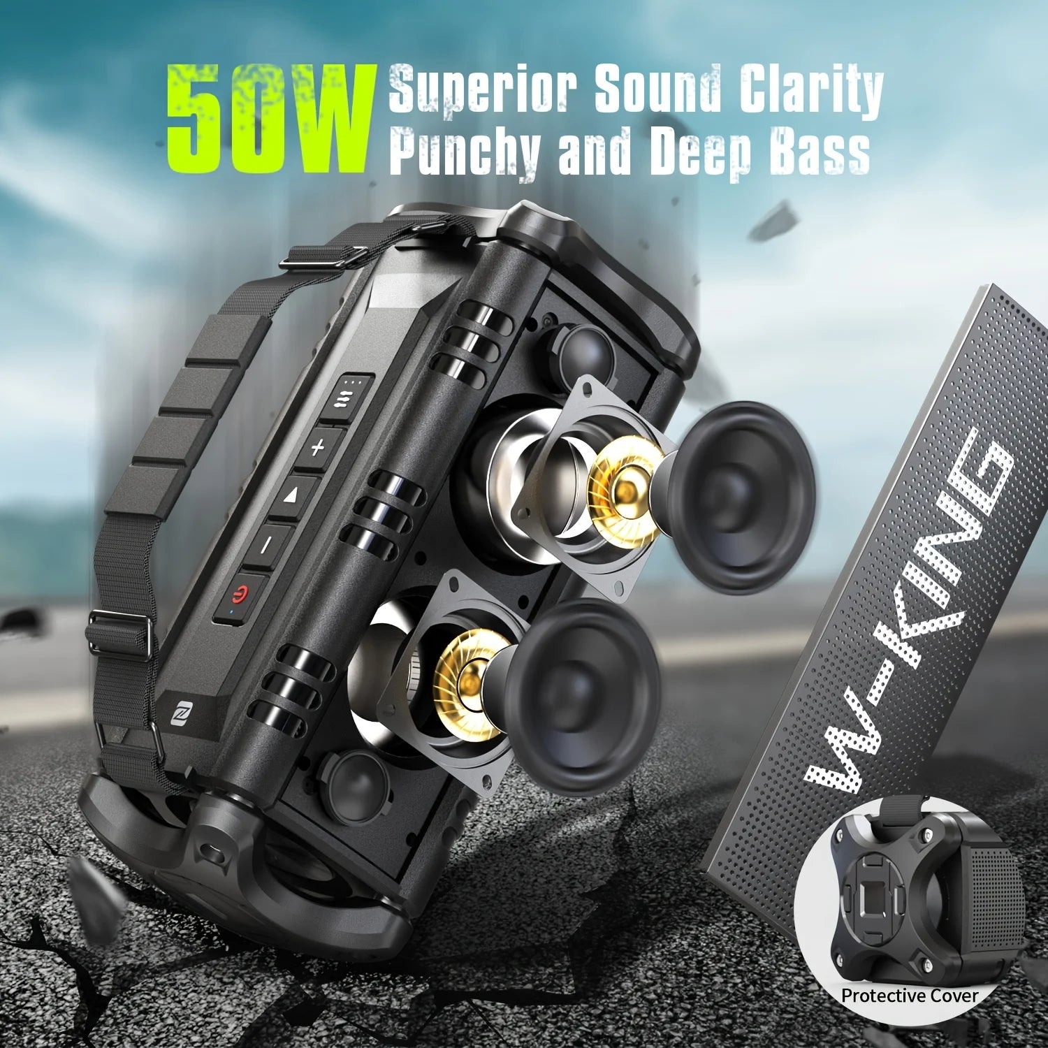 IPX6 Waterproof & 40H Playback & Power Bank - W-KING outdoor speakers features waterproof and shockproof mechanical casings which are suitable for outdoor adventures. No need to worry when using by the sea, beach,pool party, on a boat, or in a shower room. With a massive rechargeable battery, a single charge gives you enough juice to 40 hours of playtime. can also be used as a power bank to charge phones or other devices, making it a great camping gifts. Enjoy loud sound with powerful bass and clear vocals at home, in the garage, at wedding, or outside on the road