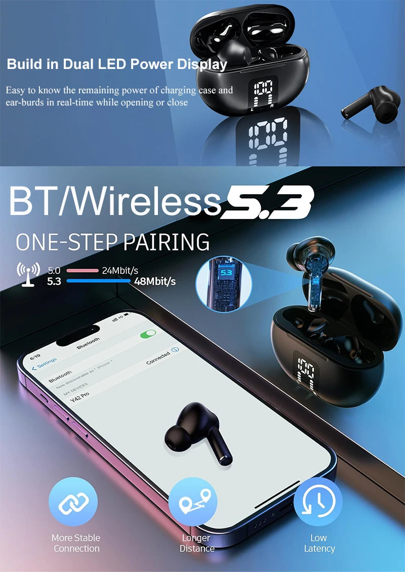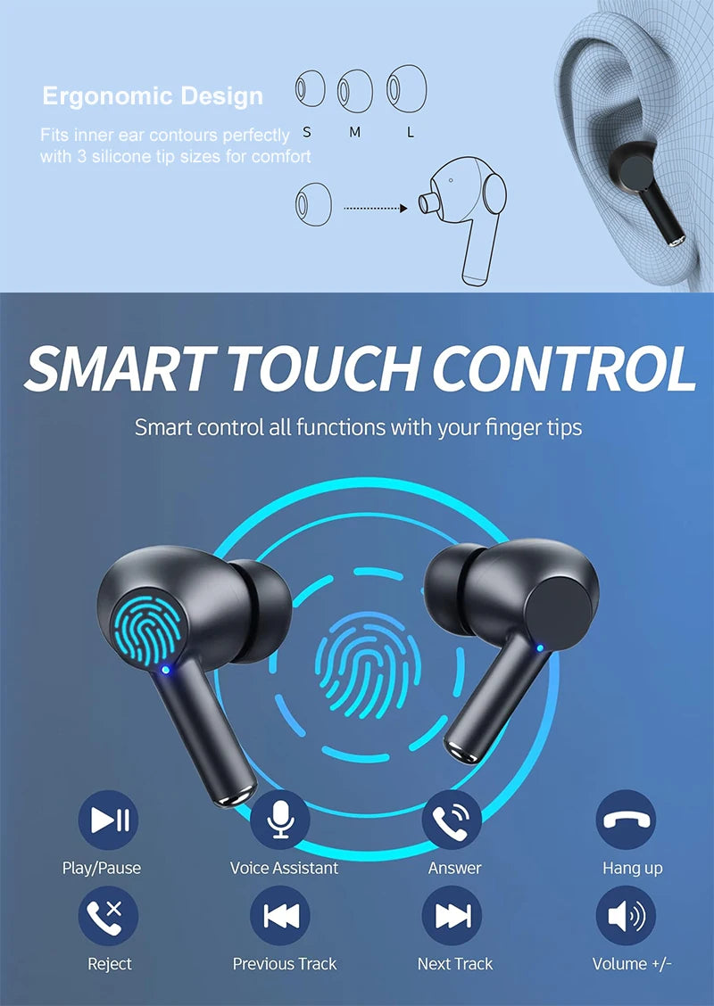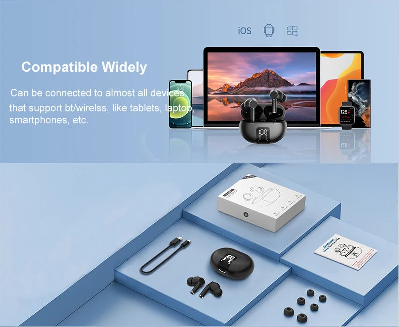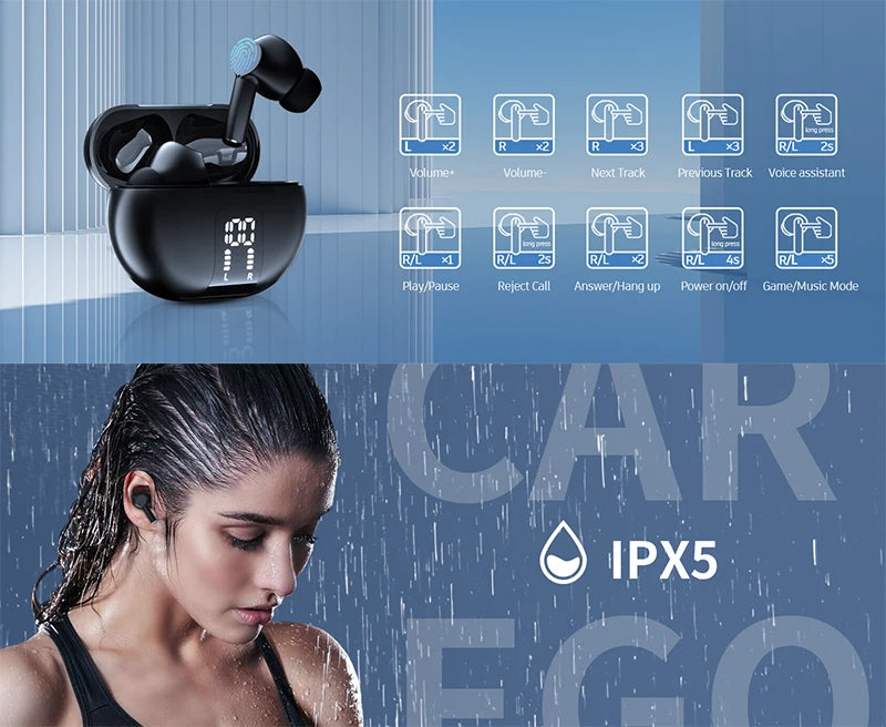 Wireless Earphone Bluetooth 5.3 Headphone 60H Playback LED Power Display Ear Buds Mic Noise Cancellation Stereo Sound Earphones
